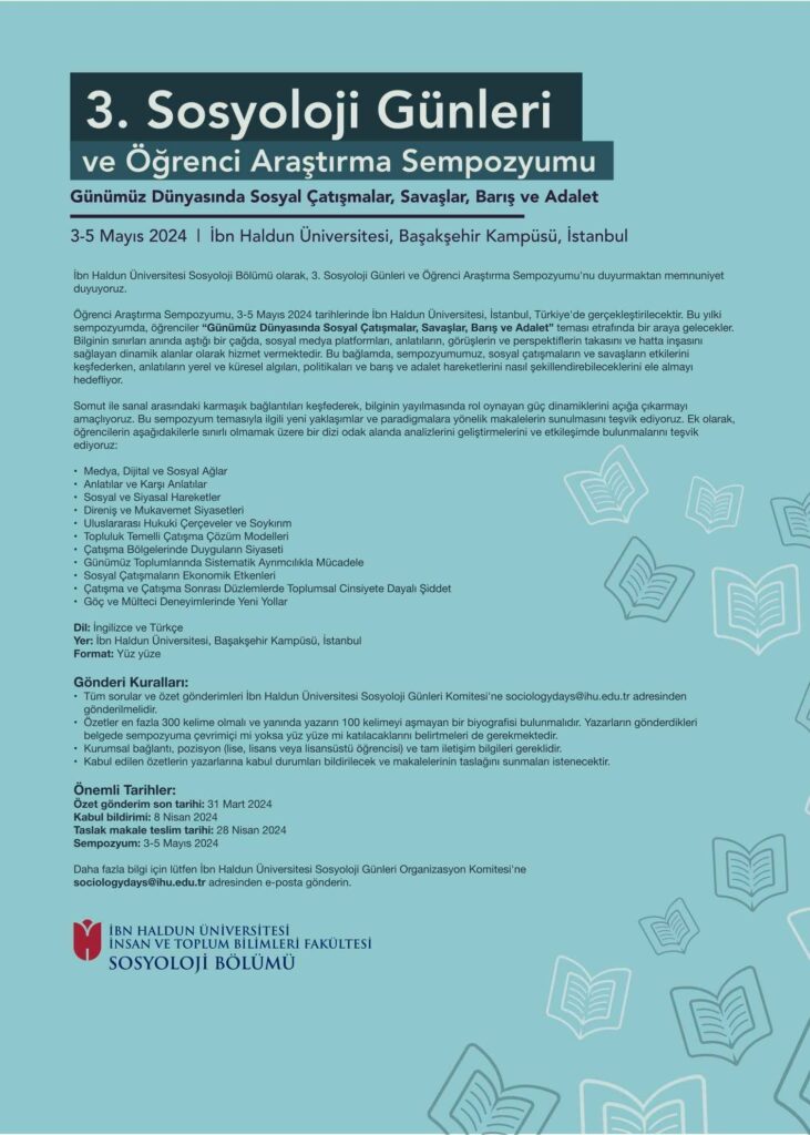 Öğrenci Araştırma Sempozyumu, 3-5 Mayıs 2024 tarihlerinde İbn Haldun Üniversitesi, İstanbul, Türkiye’de gerçekleştirilecektir. Bu yılki sempozyumda, öğrenciler “Günümüz Dünyasında Sosyal Çatışmalar, Savaşlar, Barış ve Adalet” teması etrafında bir araya gelecekler.
