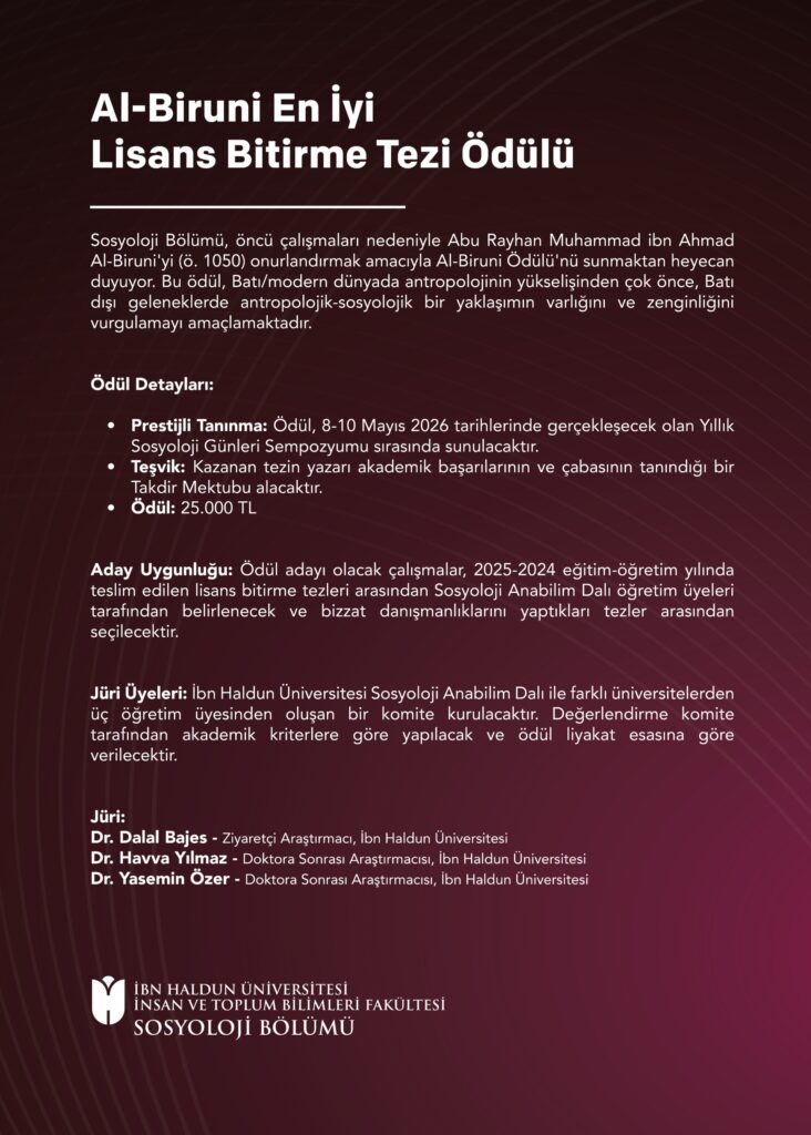 Sosyoloji Bölümü, öncü çalışmaları nedeniyle Abu Rayhan Muhammad ibn Ahmad Al-Biruni’yi (ö. 1050) onurlandırmak amacıyla Al-Biruni Ödülü’nü sunmaktan heyecan duyuyor. Bu ödül, Batı/modern dünyada antropolojinin yükselişinden çok önce, Batı dışı geleneklerde antropolojik-sosyolojik bir yaklaşımın varlığını ve zenginliğini vurgulamayı amaçlamaktadır.