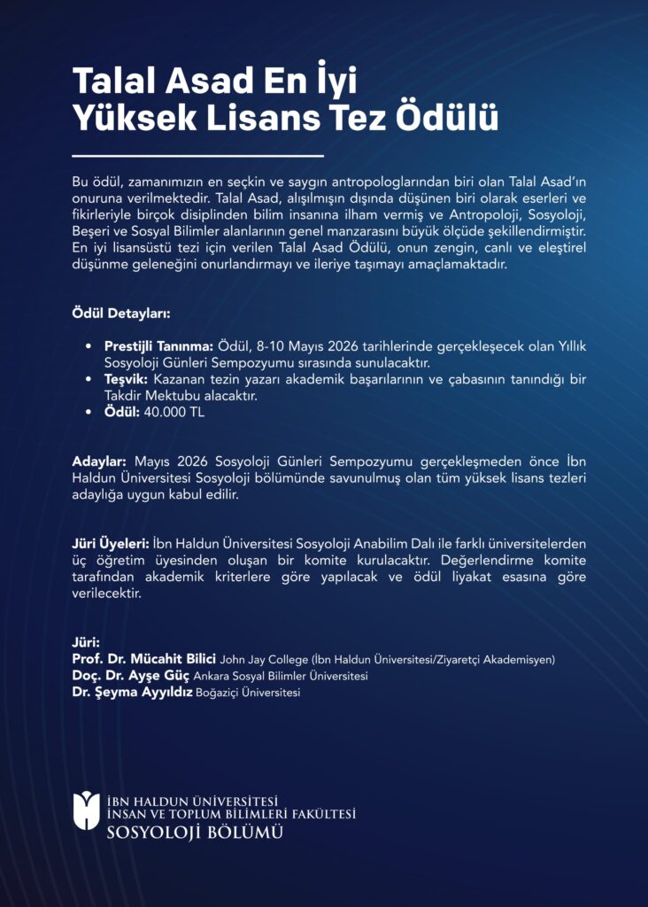 Bu ödül, zamanımızın en seçkin ve saygın antropologlarından biri olan Talal Asad’ın onuruna verilmektedir. Talal Asad, alışılmışın dışında düşünen biri olarak eserleri ve fikirleriyle birçok disiplinden bilim insanına ilham vermiş ve Antropoloji, Sosyoloji, Beşeri ve Sosyal Bilimler alanlarının genel manzarasını büyük ölçüde şekillendirmiştir. En iyi lisansüstü tezi için verilen Talal Asad Ödülü, onun zengin, canlı ve eleştirel düşünme geleneğini onurlandırmayı ve ileriye taşımayı amaçlamaktadır.