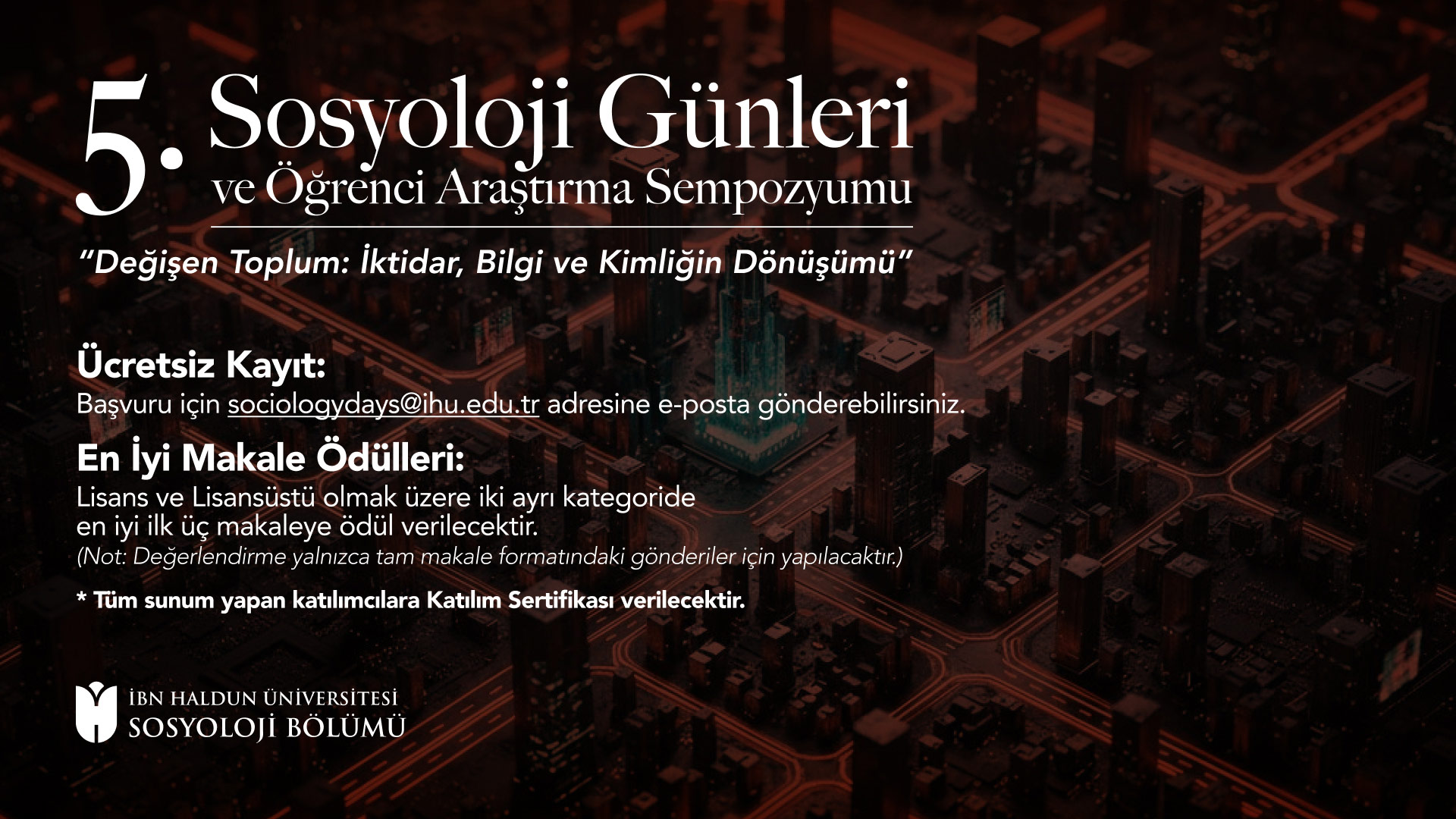Adaylar: Mayıs 2026 Sosyoloji Günleri Sempozyumu gerçekleşmeden önce İbn Haldun Üniversitesi Sosyoloji bölümünde savunulmuş olan tüm yüksek lisans tezleri adaylığa uygun kabul edilir.